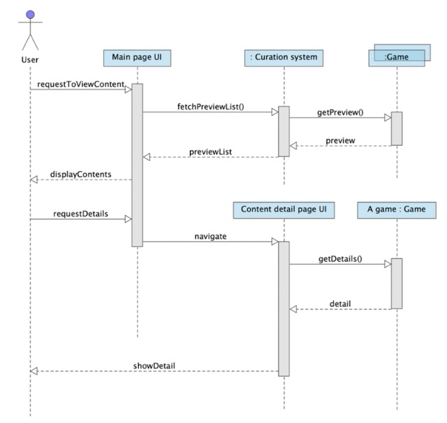 진행 과정: 콘텐츠 목록 요청 및 표시 사용자는 메인 페이지 UI에 콘텐츠 목록을 요청한다. (requestToViewContent) 메인 페이지 UI는 큐레이션 시스템에 콘텐츠 미리보기 목록을 요청한다. (fetchPreviewList()) 큐레이션 시스템은 게임 객체 집합으로부터 미리보기 정보를 요청한다. (getPreview()) 각 게임 객체는 큐레이션 시스템에 미리보기 정보를 반환한다. (preview) 큐레이션 시스템은 메인 페이지 UI에 콘텐츠 미리보기 목록을 전달한다. (previewList) 메인 페이지 UI는 사용자에게 콘텐츠 목록을 화면에 출력한다. (displayContents) 콘텐츠 상세 조회 및 화면 출력 1. 사용자는 특정 콘텐츠에 대한 상세 정보를 요청한다. (requestDetails) 2. 메인 페이지 UI는 콘텐츠 상세 페이지 UI로 화면을 전환한다. (navigate) 3. 콘텐츠 상세 페이지 UI는 게임 객체(a game)에 콘텐츠 상세 정보를 요청한다. (getDetails()) 4. 게임 객체(a game)는 콘텐츠 상세 정보를 콘텐츠 상세 페이지 UI에 반환한다. (detail) 5. 콘텐츠 상세 페이지 UI는 사용자에게 콘텐츠 상세 정보를 출력한다. (showDetail)