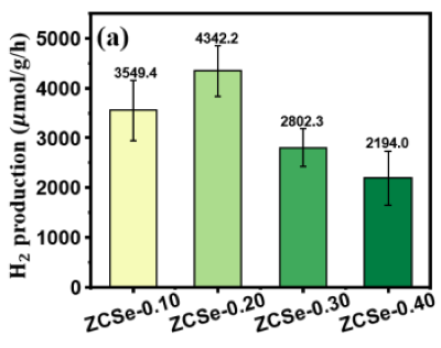 Fig 13.은 ZnO/CdS(1-x)Se(x) 복합체에서 Se 도입 비율(x)을 변화시켰을 때의 수소 생산 속도를 나타낸다. ZCSe-0.10, ZCSe-0.20, ZCSe-0.30, ZCSe-0.40 시료의 H₂ 생성량은 각각 3549.4, 4342.2, 2802.3, 2194.0μmol·g-1·h-1로, Se 비율이 0.20일 때 가장 높은 활성을 보이고 이후에는 점차 감소하는 경향을 나타낸다. 이는 소량의 Se 도입(0.10 → 0.20)이 CdS shell 내에서 CdS(1-x)Se(x) 상을 형성하여 밴드갭을 적절히 좁히고 가시광 흡수 범위를 확장하는 동시에, S 공공(sulfur vacancy)을 부분적으로 passivation하여 전하 재결합을 억제하기 때문으로 해석된다. 이때 ZnO/CdS에서 이미 형성된 Z-scheme 밴드 정렬은 크게 왜곡되지 않아, 넓어진 광 응답(photoresponse)과 효율적인 전하 분리가 동시에 확보되는 조합이 ZCSe-0.20에서 구현된 것으로 보인다.