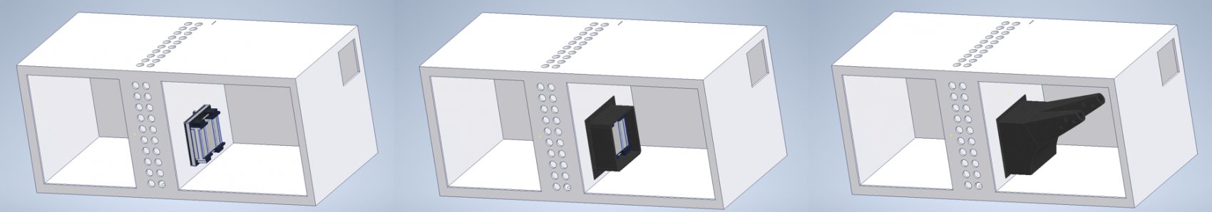 신발장의 프레임을 구성하는 데 있어, 펠티어 모듈의 소형 방열판 및 PTC 히터의 치수를 고려해 각각 40.5mm X 60.5mm와 120.5mm X 120.5mm의 직사각형 구멍을 내었다. 3면에 반지름 1cm의 원형 구멍을 각 20개씩 내어 송풍이 원활하도록 하였으며, 뒷면은 7cm의 간격에 대해 큰 직사각형 구멍을 내었다. 이는 각 모듈의 조립 및 전자회로 구성을 위해 여유를 둔 것이다.