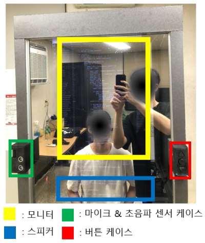 - 원웨이미러필름을 아크릴 판의 전면에 붙여 하프 미러 기능을 구현하였다. 하프미러는 폭 47.5cm, 높이 172cm로 전신 거울의 역할을 할 수 있도록 하였다. 모니터 높이는 대한민국 평균 눈높이가 156cm인 것을 참조하여 모니터 중심의 높이가 156cm가 되도록 하였다. 라즈베리파이, 모니터, 브레드보드, 스피커는 본체 프레임 내부에 위치시켰다. 버튼 케이스와 마이크 & 초음파 센서 케이스는 본체 프레임 외부에 위치하며, 버튼 케이스는 우측 프레임, 마이크 & 초음파 센서 케이스는 좌측 프레임에 위치한다.