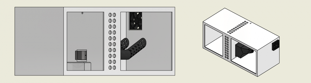 초기 구상한 신발장 프레임에 대한 기본적인 틀은 위와 같다. 좌측을 저온 제습에 대한 공간, 우측을 고온 건조에 대한 공간으로 나누었다. 프레임의 중앙부에는 펠티어 모듈과 히터 모듈을 결합하는 개념이다.