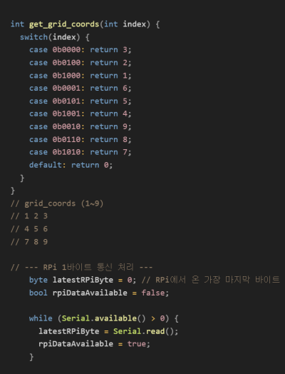 위에서 초기화된 시리얼 포트를 통해 Arduino로 데이터를 전송하도록 하는 함수 sendCommandToArduino를 구현하였다. 이 함수는 고수준의 제어 정보(Glare 유무, 그리드 좌표)를 1바이트 통신 프로토콜에 맞춰 패킹하고 전송하는 역할을 한다.