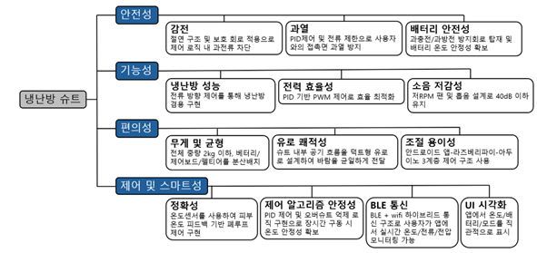 - 분산 배치 및 모듈화: 펠티어 소자를 등과 복부에 분산 배치하고, 유지보수가 쉬운 교체형 배터리 시스템 적용.