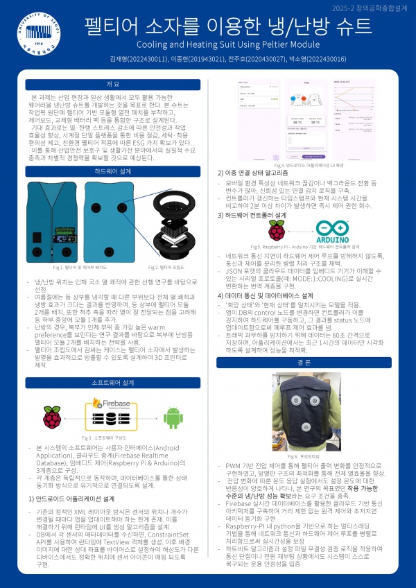 - 하드웨어: 작업복(조끼 및 바람막이) 내부에 3D 프린팅된 펠티어 모듈 5개가 견고하게 부착되었으며, 배선은 의류 내부로 매립되어 착용 시 불편함을 최소화함.
