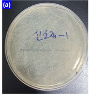- 우측의 사진들이 3일간의 배양 후 확인된 배지의 콜로니 배양상태이다. 좌측의 (a) 배지는 자외선을 조사하지 않은 배지이고, 우측의 (b) 배지는 자외선을 조사한 배지이다. (b) 사진의 초록색 원으로 그려진 범위가 자외선의 조사범위로 그 안에는 콜로니가 배양되지 않았음을 확인할 수 있다.
